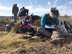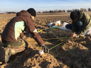 [Top right image: UB Survey crew members transport hay to cover and preserve test units before a big frost. The winter of 2017 was warmer than usual, and the crew was able to work throughout most of the early months.]